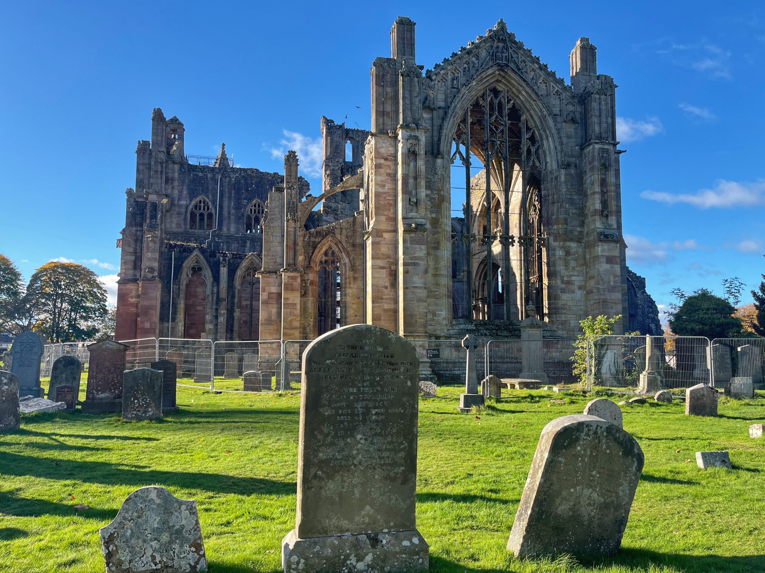 Die Bahn brachte mich dann über Edinburgh Waverley in die Scottish Borders. Dort am River Tweed wartete die erste der insgesamt vier Border Abbeys, die die schottischen Könige im 12. Jahrhundert erbauen ließen. Das keltische Vorgängerkloster lag ein bisschen weiter flussabwärts. Der St. Cuthbert’s Way führt aber dort nicht vorbei (es gibt auch nichts mehr zu sehen), sondern über die Vulkankegel der Eildon Hills nach St. Boswells – benannt nach dem Iren Boisil, Lehrer und Mentor des jungen Cuthbert. Auf den ersten Etappen sind drei der vier Border Abbeys zu sehen: Melrose, Dryburgh und Jedburgh. Für die letzte muss man ein paar Kilometer vom eigentlichen Weg abweichen. Nur Kelso bleibt buchstäblich links liegen. Alle Border Abbeys sind Ruinen. Wenn es nicht die Kriege zwischen England und Schottland waren, dann die Reformation.