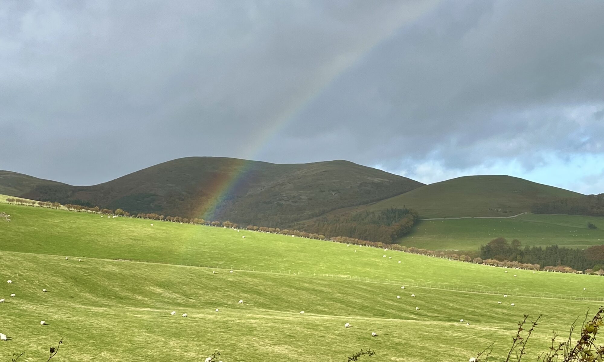 Letzte Woche war ich auf dem St. Cuthbert’s Way unterwegs durch die Cheviot Hills in Northumberland. Der kräftige Westwind schob immer mal wieder eine Wolke heran, aus der etwas Sprühregen fiel. Dann kam die Sonne wieder heraus, und der Wechsel wurde mnachmal von einem Regenbogen begleitet. Ich blieb stehen, machte ein Foto, und ließ mich dann weiterpusten.